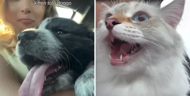 На кадрах голубоглазая белая кошка, увидев собаку, начала ее обнюхивать сперва, но потом открыла рот, словно дублировала поведение пса.