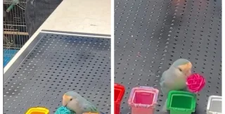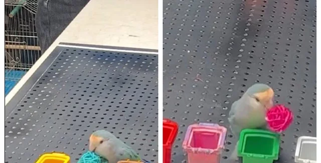 Попугай Сяогуй должен был справиться с нелегкой для птицы задачей. Перед ним установили десять крошечных контейнеров и еще десять соломенных шариков разных цветов. Птице нужно было отсортировать их по цветам, разместив цветные шарики в контейнеры соответствующего цвета.