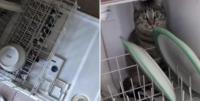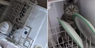 38-летний Кал Винсент рассказал, что его питомец постоянно ищет новые укромные уголки и "лезет туда, куда не положено". Среди любимых мест — кухонные шкафы, ящики и, неожиданно, посудомоечная машина.