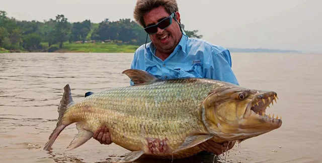 Гигантская тигровая рыба, также известная на языке суахили как мбенга, считается африканским аналогом пираньи, только гораздо крупнее и смертоноснее. У нее 32 острых как бритва зуба, которыми она способна охотиться даже на небольших крокодилов. Несмотря на устрашающий вид, эти существа довольно хрупкие, поэтому после взвешивания и фотосессии Гэри отпустил рыбу обратно в воду.