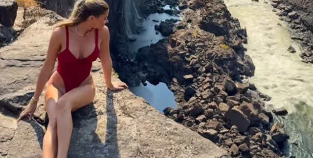На видео, опубликованном девушкой в Instagram, она сидит на краю скалы в красном купальнике, наслаждаясь видом на один из самых известных водопадов мира.