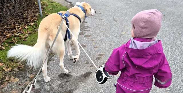 Тогда отец придумал хитрое решение. Он прикрепил к шлейке Болта еще один поводок специально для ребенка, в то время как сам держит основной. Для девочки это выглядит так, будто именно она ведет собаку. Это не только успокаивает малышку, но и делает прогулку для нее настоящим праздником. На видео девочка радостно пританцовывает рядом с питомцем.