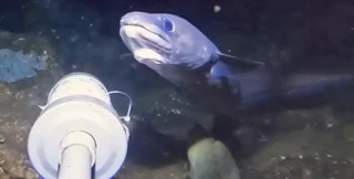 Видео было снято на глубине около 200 метров. Камера, прикрепленная к приманке, показала хищных угрей, паукообразных крабов и даже бородатого огненного червя.