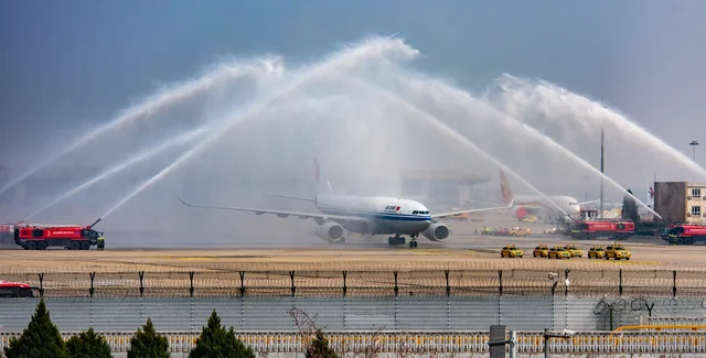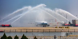 Водный салют для самолетов — это праздничная церемония, в ходе которой две пожарные машины распыляют воду дугами над самолетом, создавая "туннель", под которым лайнер медленно проезжает. Подобная традиция есть и на флоте, когда корабли обливают водой из брандспойтов., пишет Daily Mail.