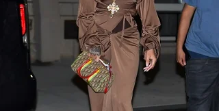 Певица на вечернем показе Alaia надела наряд от бренда от Jawara Alleyne. Верх состоял из коричневого корсета, поверх которого модница надела свободную шелковую рубашку с удлиненными рукавами. Мать двоих детей уложила свои темные волосы объемными волнами, которые ниспадали ей на плечи. В качестве аксессуаров она выбрала солнцезащитные очки-авиаторы с толстыми линзами Phoebe Philo и большое золотое ожерелье с крестом Sabyasachi. Рианна дополнила свой образ парой коричневых туфель с ремешками от Manolo Blahnik.
