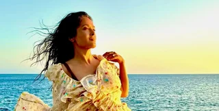 На фото Сальма позировала на палубе яхты на фоне заката. Она примерила малиновый купальник и легкое светлое платье. Хайек дополнила летний образ осенью браслетами и распустила свои темные волосы.