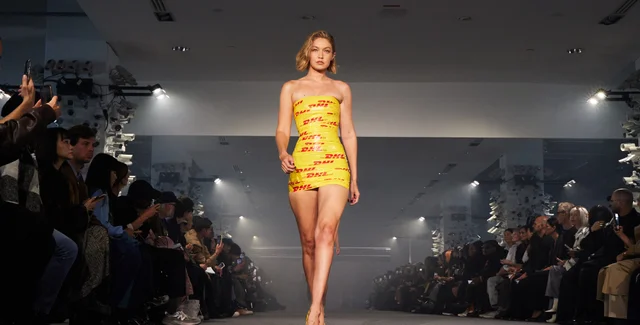 29-летняя американская супермодель Джиджи Хадид вышла на подиум на показе бренда Vetements на Парижской неделе моды, замотанная желтым скотчем с логотипом DHL, пишет Teen Vogue.