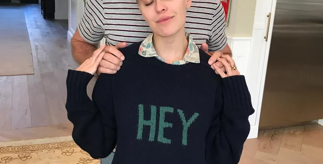 На первом Брюс — в серой полосатой футболке и брюках стоит позади своей дочери и целует ее в голову, а на ней — черный свитер с надписью "Hey" (Привет).