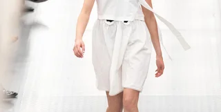 Девушка вышла на подиум в белом платье, которое было украшено нежным кружевом с люверсами на проймах и подоле юбки. Его талия присобрана спереди, открывая небольшие вырезы, где верх прикреплен к юбке. Вырез включал две каскадные белые полосы, напоминающие шарф, одна из которых была накинута сзади. Завершали образ темно-синие гетры и черные туфли-лодочки с открытым носком и белой отделкой.