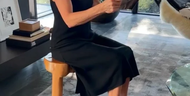 Дженнифер сидит на деревянной табуретке в черном платье средней длины, которое она дополнила прозрачными очками-авиаторами и черными вьетнамками