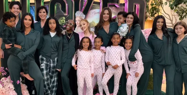 Крис Дженнер, Кайли Дженнер, Гранде, Эриво, Хлоя Кардашьян, Кортни Кардашьян Баркер и Ким затем позировали для милой фотографии, одетые в зеленые пижамы, а дети знаменитой семьи — в розовые.