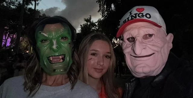 Тем временем Дэвид надел устрашающую маску и бейсболку с надписью "I Heart Bingo", сохранив при этом повседневный стиль одежды: черную футболку и кожаную куртку. Пара выглядела в хорошем расположении духа, позируя для фотографий со своей младшей дочерью Харпер, которая была одета как заключенная в оранжевый комбинезон и наручники.