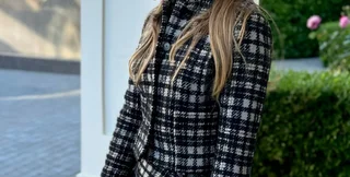 На снимках Лопес позирует в сером костюме от Dior, состоящем из короткого приталенного жакета и очень короткой юбки с запахом. Образ она дополнила черной стеганной сумочкой и оригинальными сапогами с открытой пяткой.