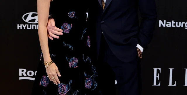 Жена Гира для вечера выбрала потрясающее длинное черное платье без бретелек с аппликациями в виде цветов из красочных розовых и синих камней по всему наряду. В качестве аксессуаров Алехандра выбрала золотые серьги-кольца, потрясающее золотое ожерелье и браслеты, усыпанные бриллиантами.