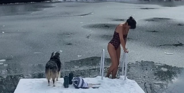 Датская супермодель показала, как ныряет в ледяной пруд. Звезду поддерживал ее домашний любимец.