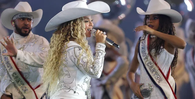 Во время исполнения песни Texas Hold 'Em Блу Айви выполняла хореографию вместе со звездной мамой. Для подростка FROLOV создал корсет, кастомно инкрустированный кристаллами и брюки со знаковыми для бренда разрезами на коленях и бахромой, изготовленной из вывязанного вручную кружева. Дополняла образ пряжка с бизоном, инкрустированная кристаллами.
