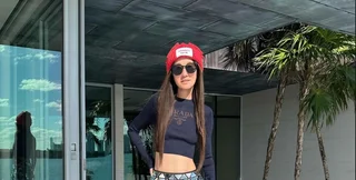 Знаменитость примерила юбку с блестящими пайетками. К образу она добавила красную шапку, несмотря на солнечную погоду.