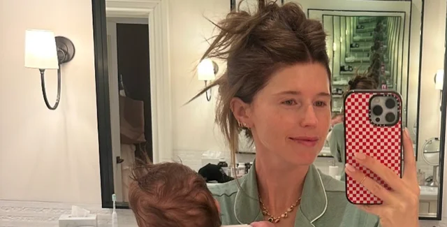 На первом фото 35-летняя писательница держала на руках маленького Форда Фицджеральда, который родился осенью 2024 года. Дочь 77-летнего Арнольда Шварценеггера позировала перед зеркалом в ванной комнате. Многодетная мама одета в светло-зеленую пижаму и держит самого маленького ребенка на руках.