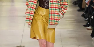 Девушка продефилировала перед гостями в шоколадно-коричневом латексном топе с вырезом-замочной скважиной в сочетании с горчично-желтой латексной юбкой. Она также добавила разноцветный клетчатый жакет и коричневые сапоги до колена. Волосы модели уложили в объемный начес.