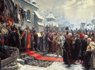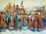 ТАКИЕ РАЗНЫЕ РАДЫ. Версию советской историографии — с долгожданным единением братских народов и всеобщим ликованием — лучше всего иллюстрирует картина советского художника Михаила Хмелько 1951 года "Навеки с Москвой, навеки с русским народом" (фото 1). Более реалистичным выглядит написанное в 1880-м полотно Алексея Кившенко "Переяславская Рада" из коллекции Московской государственной библиотеки (фото 2)