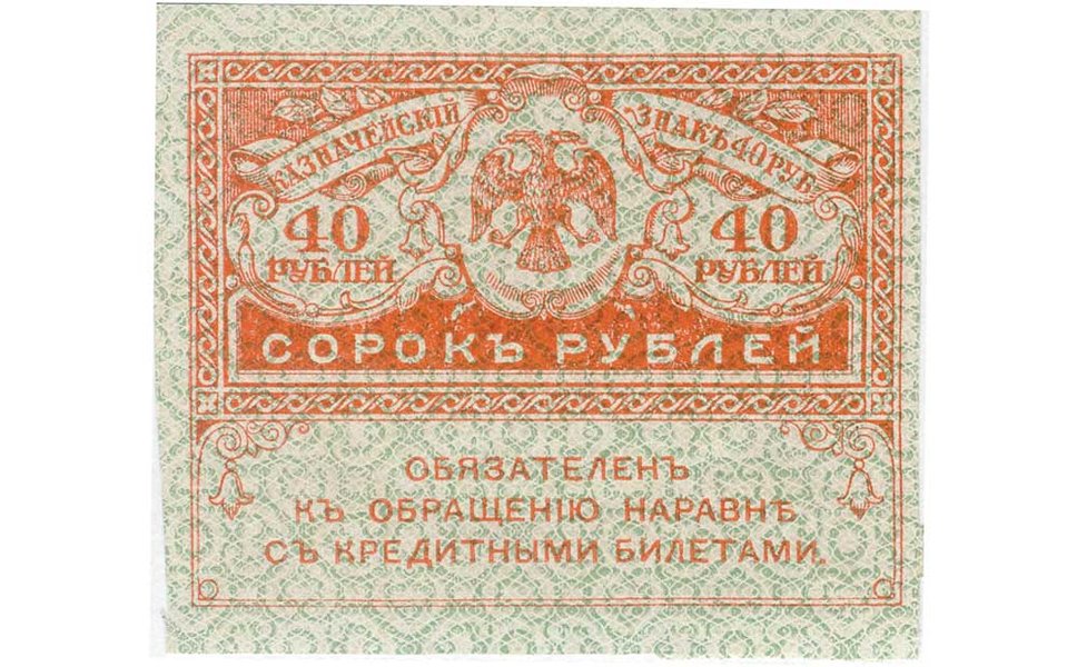 При нестабильной государственной власти роль "нацбанка" примеряли на себя города, коммерческие фирмы, военные администрации и даже небольшие лавки. Суррогатные деньги обещали обменивать на государственные, "имеющие быть выпущенными" после укрепления власти.