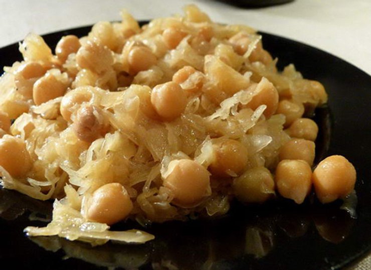 Приготовление: горох промойте и замочите на ночь, затем отварите до готовности. Поместите кислую капусту в широкую кастрюлю с небольшим количеством воды, добавьте специи. Отдельно в сковороде разогрейте масло, поджарьте на нем нарезанный кружочками лук. Когда капуста станет мягкой, добавьте к ней жареный лук, вареный горох, посолите, и варите 30-40 минут.