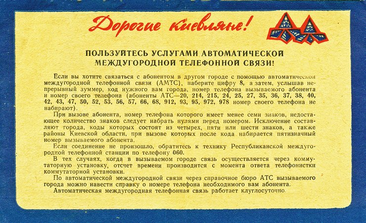 Полностью на автоматическую связь — с любым населенным пунктом — киевляне перешли в начале 1980-х. Исчезло разделение звонков на обычные и срочные. Фактически любой звонок стал срочным, но оплачивался по обычному тарифу. Удобно. Правда, качество связи иногда бывало отвратительным.