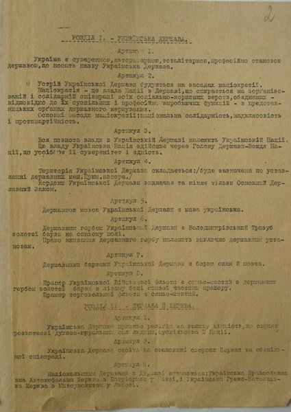 В сентябре 1939 года ведущий теоретик ОУН Николай Сциборский по заказу лидера организации подготовил проект конституции Украинской державы — суверенной, авторитарной и тоталитарной