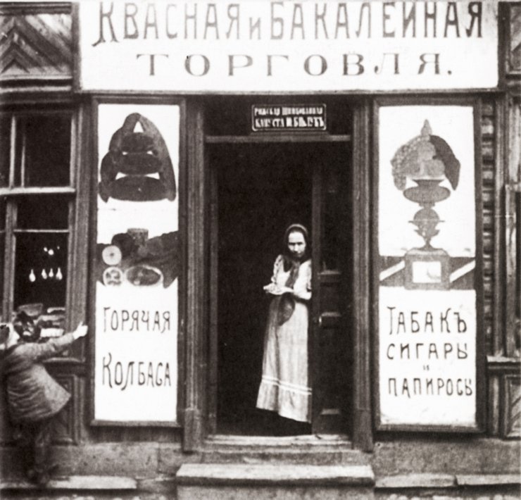 Лавочники использовали в качестве рекламных носителей ставни, прикрывавшие вход в заведение. Когда лавка открыта, задние стенки ставен смотрят наружу, а на них нарисована (иногда очень любительски) продукция, соответствующая профилю магазина, — хлеб, колбаса, фрукты, виноград и т. д. Витрины нередко украшались плакатами с незатейливыми рисунками и надписями вроде: "Лучший друг желудка: вино "Сан Рафаэль"" или "Галоши "Проводник". Первейшие в мире по высшей прочности, доброкачественности и изяществу фасонов".