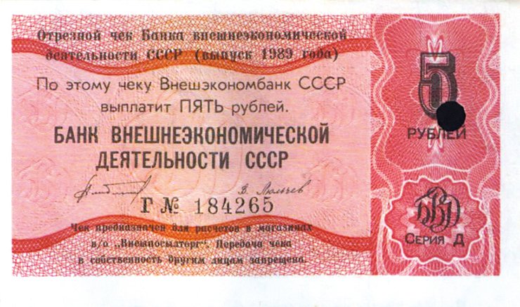 Чек Внешэкономбанка на сумму 5 руб. По нему в специальных магазинах "Внешпосылторга" можно было купить недоступные дефициты. За два десятка таких чеков покупались джинсы