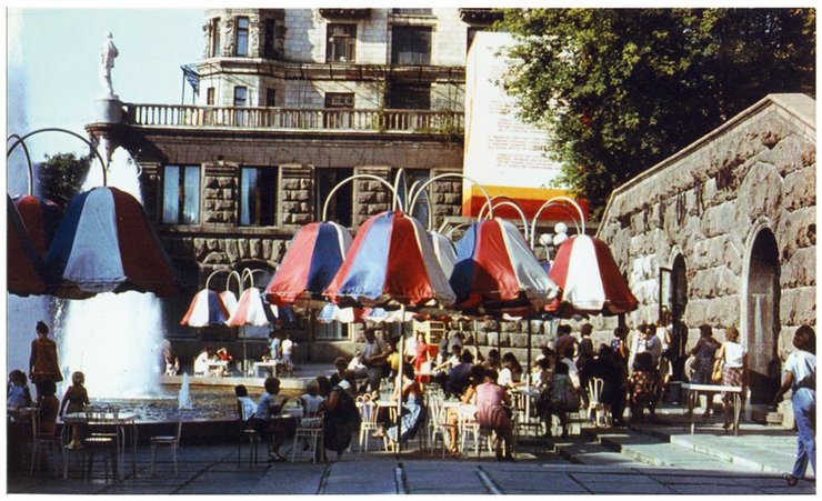 Решение джинсового вопроса, если вы не студент (или студент вуза, где нет иностранцев), требовало неординарных поступков. Один из них — купить заветные штаны у фарцовщиков. Эта публика работала у входа в гостиницы, где проживали иностранцы ("Москва" — ныне "Украина", "Лыбидь", "Днепр"), выменивая дефицитные модные вещи на советские значки, открытки с портретом Ленина и прочие безделушки. А тусовались они на Крещатике, в знаменитой кофейне "Грот" (напротив ЦУМа). Сие заведение с пижонскими летними столиками под цветными тентами-колокольчиками на крещатицком жаргоне именовали "Мичиган". Его атмосферу Виктор Некрасов охарактеризовал коротко, но емко: "Большинство посетителей друг друга знают. Сидят компаниями. Время от времени кто-нибудь бежит в гастроном".