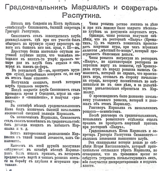 КОРРУПЦИЯ ПРИ ГЕТМАНАТЕ. Обличающая статья в газете "Свободные мысли" с заголовком: "Градоначальникъ Маршалкъ и секретарь Распутина"