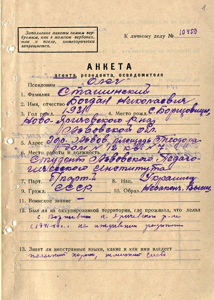 Перерождение случилось после четырехчасового допроса, когда Сташинский написал записку о том, что впредь будет "честно помогать органам МГБ в их деятельности по выявлению лиц, ведущих работу против советской власти". Он сообщил все, что знает: и о связи с районным проводом ОУН, и о националистах-однокашниках, и даже о родных сестрах. После этого Сташинскому дали агентурное имя Олег.