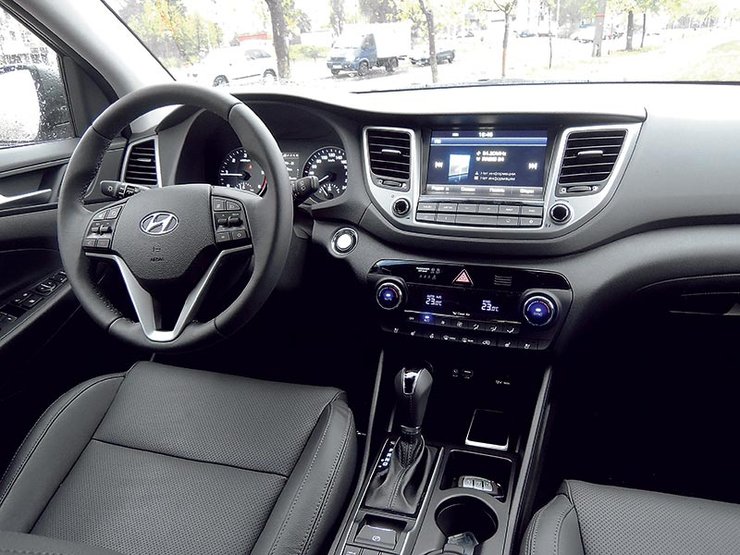Салон нового Tucson стал более просторным. Явно добавилось места для задних пассажиров, хотя колесная база была увеличена всего на 30 мм. Отсутствует ручник, который заменила небольшая кнопка электрического тормоза. Не самая лучшая обзорность заднего стекла компенсируется наличием камеры заднего вида, изображение с которой выводится на большой 8-дюймовый сенсорный экран.