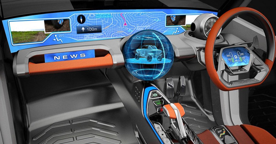 В салоне же, как видно на изображении, будет огромный монитор, расположенный под лобовым стеклом, а также шар, работающий в качестве креномера. Дисплеем также оснащен руль концепт-кара.