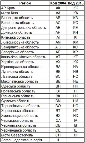 С 2004 года коды регионов были распределены исключительно с использованием букв, совпадающих в латинском и в украинском алфавитах, начиная с Киева: АА, АВ, АС и т.д., в интервалах АА-АХ, ВА-ВО, ВТ-ВХ, СА-СВ, СЕ-СН.
