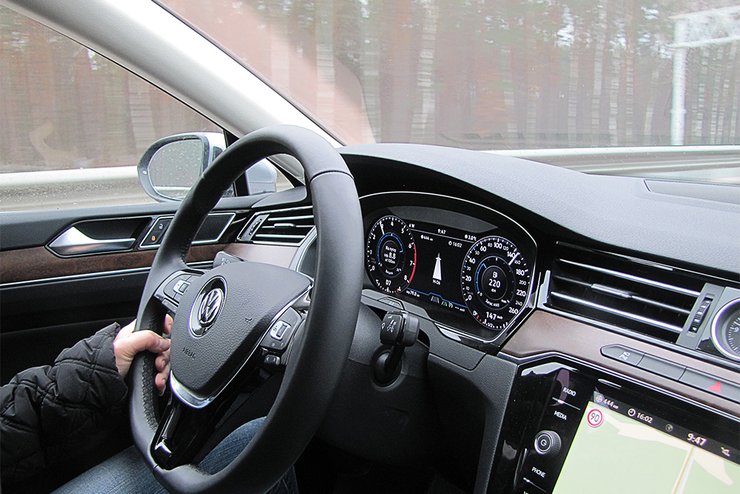 Сдержанный дизайн с мягкой подсветкой встречает нас внутри авто. Горизонтальные жалюзи воздуховодов сразу дают понять, что вы находитесь в салоне семейства VW. В Passat все опции современные: камера кругового обзора, парктроники, подогрев лобового стекла, руля и сидений. Но при посадке берегите голову: у машины покатый дверной проем. Есть расчет траектории парковки, адаптивный круиз-контроль. Кресла с электроприводом, у которых можно изменять изгиб спинки с функцией запоминания положения сиденья и зеркал.