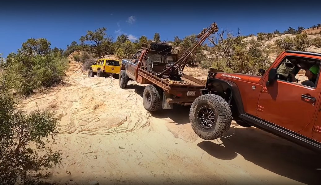 Поэтому в каньон отправились сразу три спасательных полноприводных автомобиля: два лифтованных Jeep Cherokee и специальный буксир Chevrolet с лебедкой, подъемником и оборудованием для жесткой сцепки.