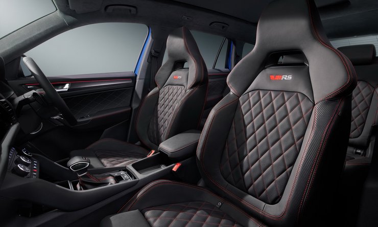 RS-версия уже в "базе" получит 20-дюймовые колесные диски, за которыми спрятаны красные тормозные суппорты, рейлинги на крыше, сдвоенные патрубки выхлопной системы и светодиодные матричные фары. Что нехарактерно для практичной Шкоды, спереди в салоне установлены спортивные "ковши", да и задний диван получил более выразительный профиль.
