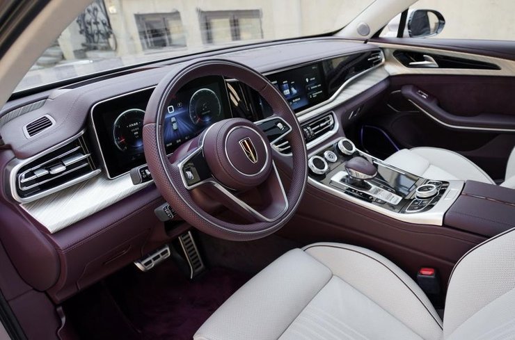 Hongqi H9 также отличается роскошной отделкой салона. Внутри установлены четыре отдельных кресла, В оформлении используются разные породы дерева, а также полированный алюминий. Мультимедийная система машины состоит из пары 12,3-дюймовых экранов.