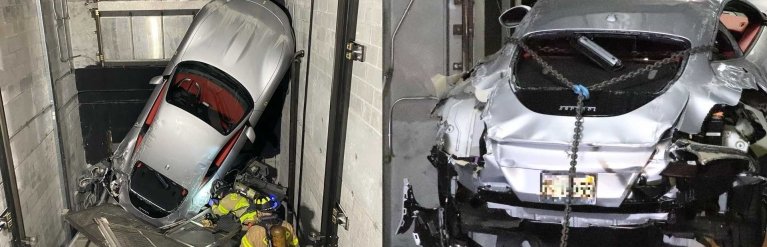 Инцидент имел место в Палм-Бис (штат Флорида). Суперкар Ferrari собирались опустить на подвальный этаж на специальном грузовом лифте. Подъемник сломался и не подъехал, поэтому автомобиль свалился в шахту лифта.