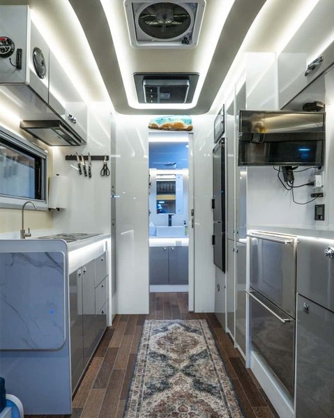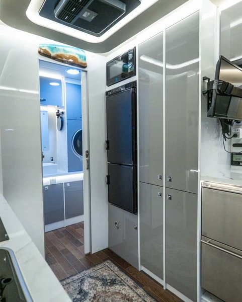 На кухне есть электроплита, раковина, два холодильника, мультиварка и микроволновая печь. В санузле нашлось место не только для душа, но и для стиральной машины. Кроме того, есть багажный отсек, в котором можно перевозить велосипеды или набор для барбекю.
