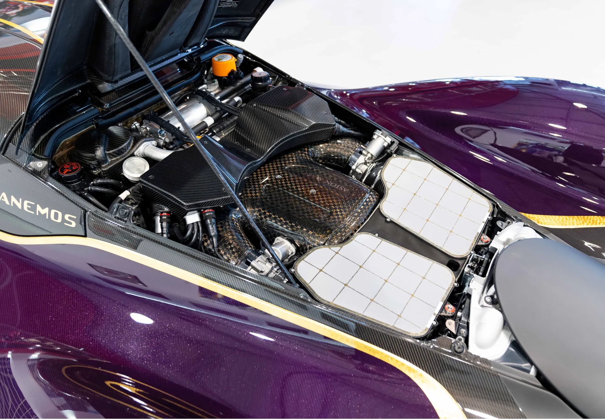 Aston Martin Valkyrie украсили 24-каратным золотом: его можно увидеть на "носу", боковинах, крыше и колесных дисках. Кроме того, кузов и салон авто окрашены в особый фиолетовый цвет. Позолота появилась и на кнопках на рулевом колесе.