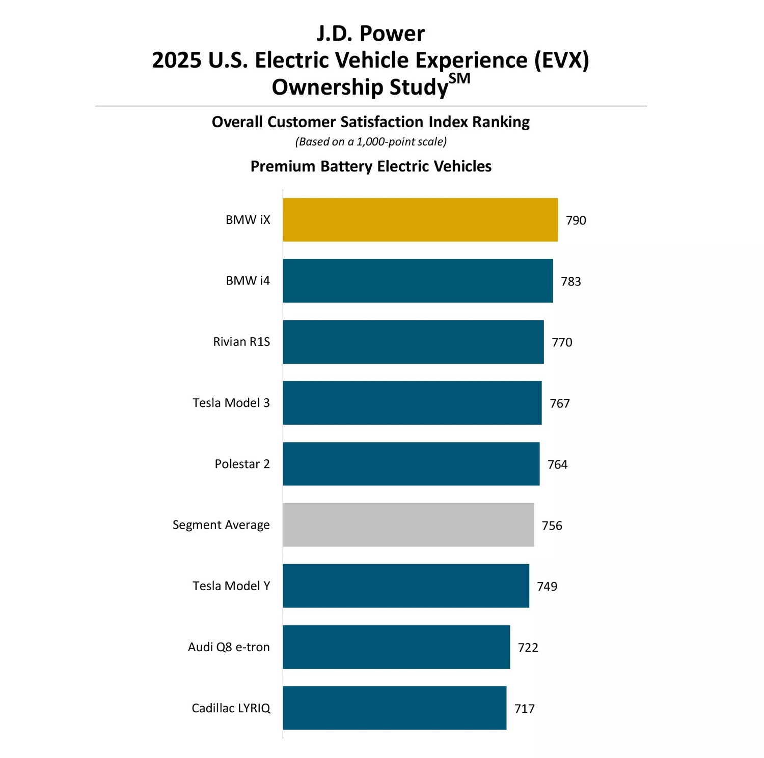 Больше всего владельцы ценят электромобили BMW. Кроссовер BMW iX набрал 790 баллов, а седан i4 — 783. Именно эти модели лидируют в премиальном сегменте, а третьим стал Rivian R1S (770 баллов).