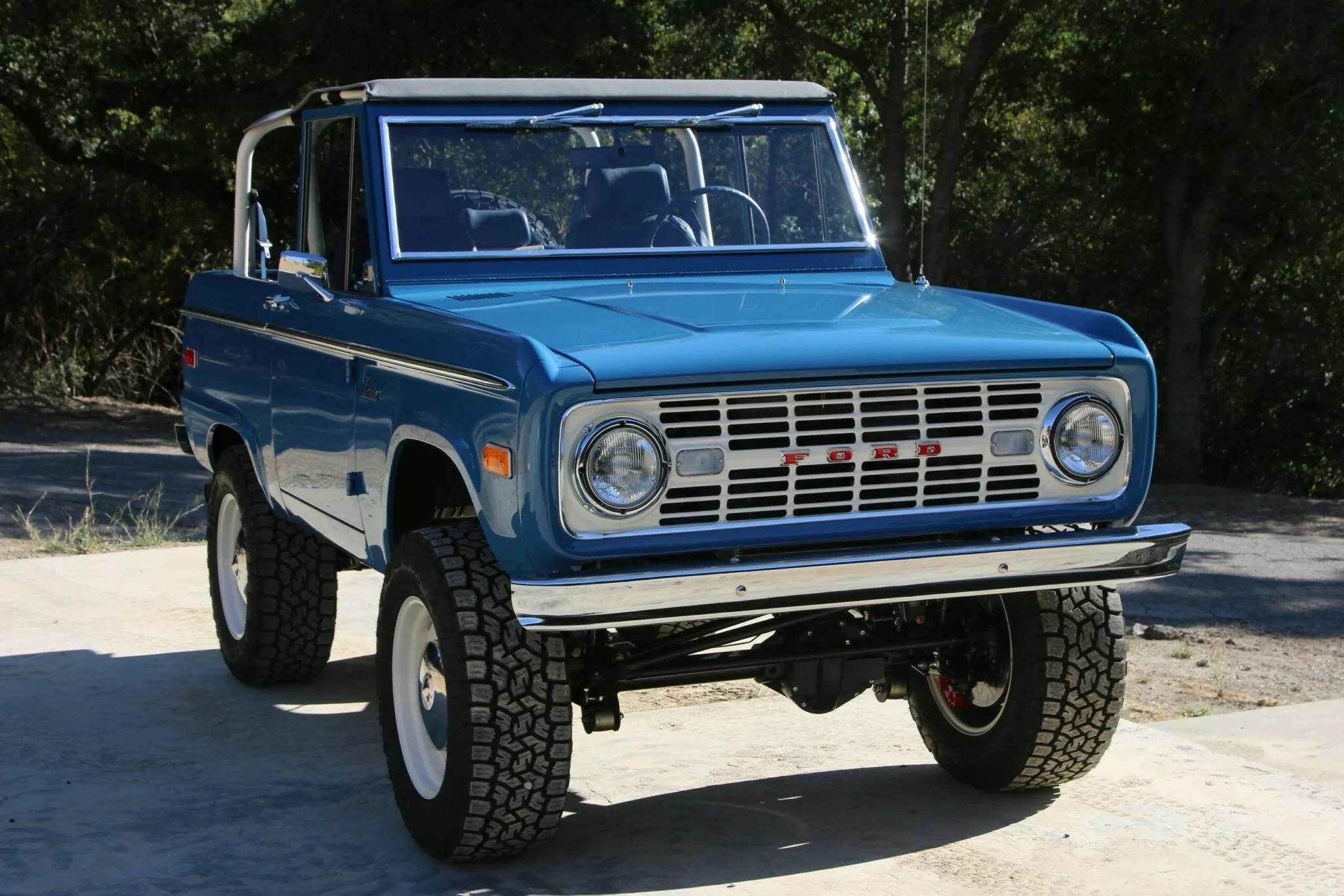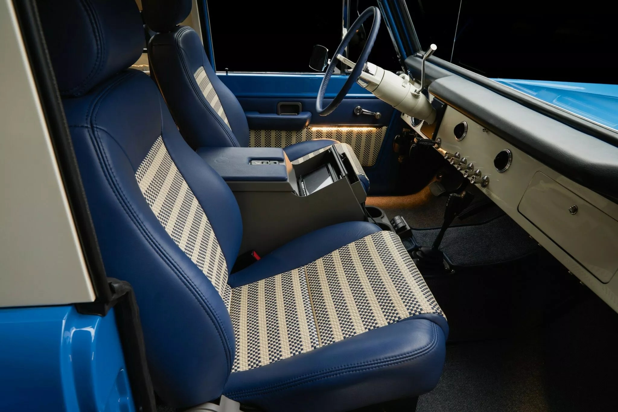 Внешне отреставрированный электромобиль Ford Bronco мало чем отличается от оригинальной модели 1966 года. Классическим остался и салон внедорожника, однако там все же улучшили отделку и установили между передними сиденьями современный сенсорный дисплей.