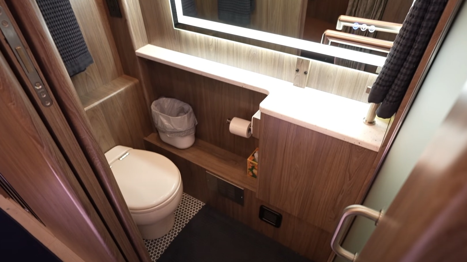 На кухне есть раковина, плита, кофеварка, микроволновая печь и холодильник. К тому же, в Russell Coach X3-45 VIP сразу два санузла. Для питания электрооборудования установили мощный генератор.