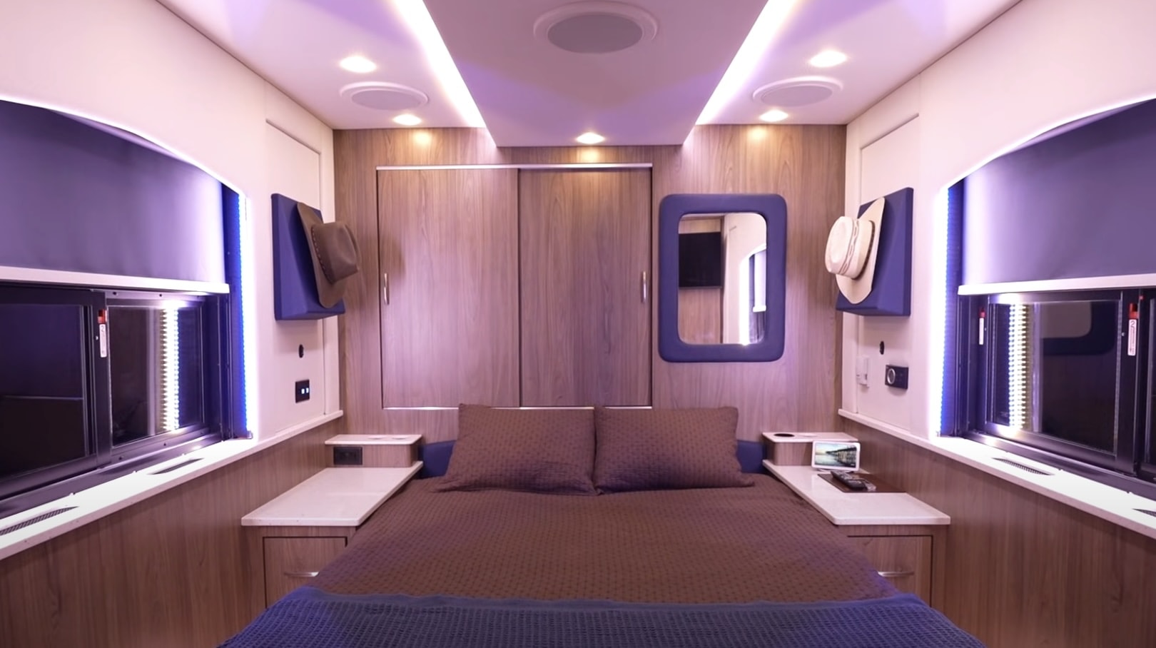 Внутри оборудовали отгороженную спальню с широкой кроватью. Дополнительно предусмотрена двухъярусная кровать в коридоре и раскладные диваны.