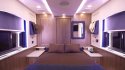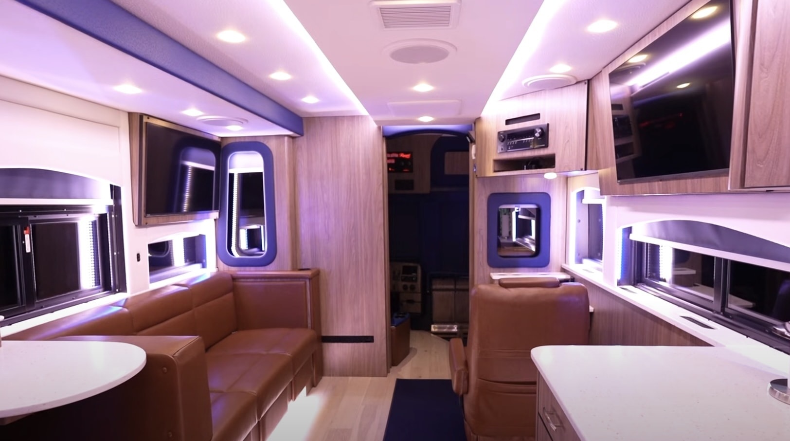 В гостиной Russell Coach X3-45 VIP установили стол, большие телевизоры и мощную акустическую систему. Появились многочисленные шкафы и ящики для одежды или посуды.