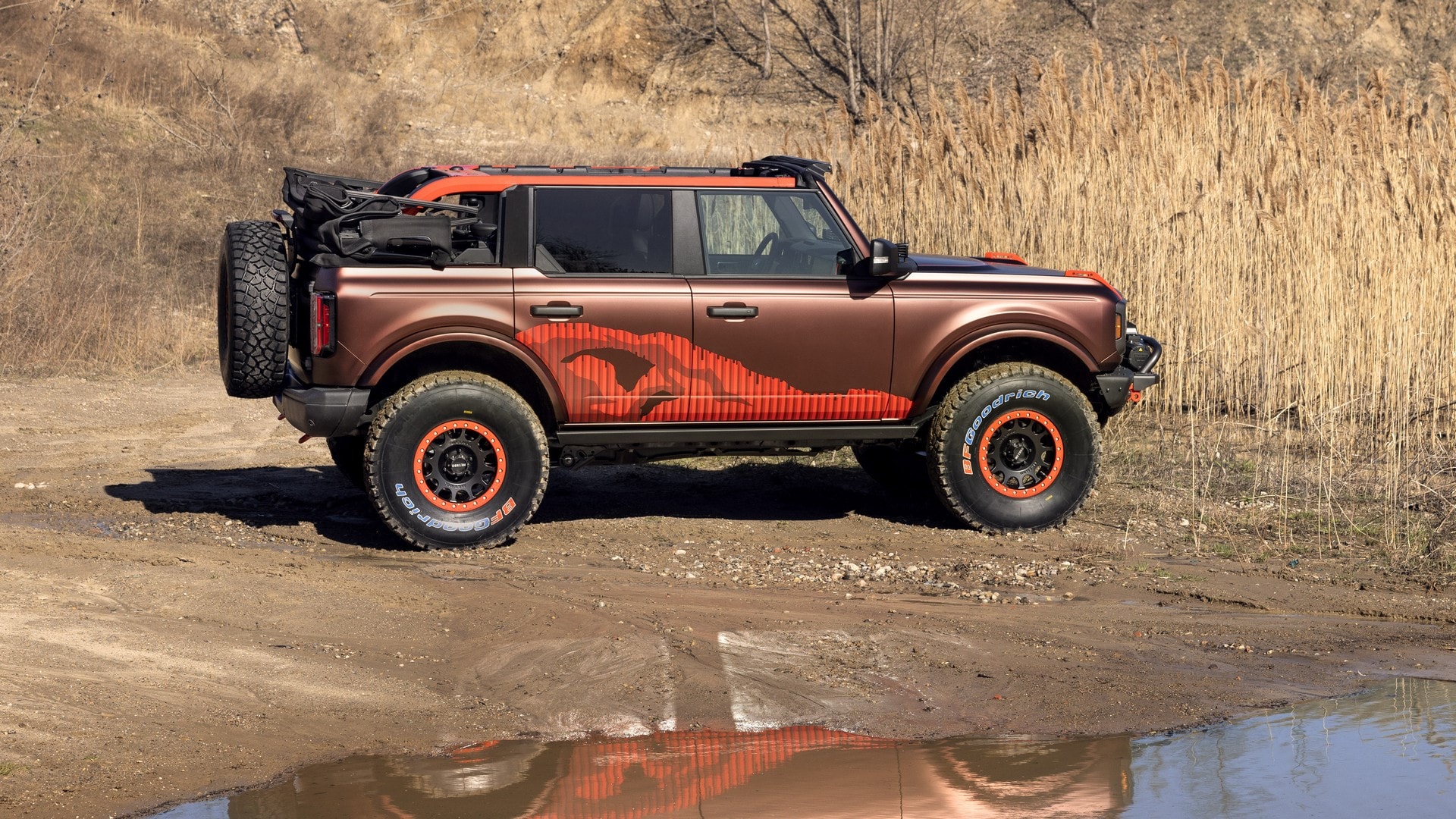 В частности, авто получило огромные 40-дюймовые шины (для них понадобились расширители арок), карбоновые ручки и поворотные дуги вместо дверей. В салоне установили спортивные кресла. Кроме того, усилили подвеску Ford Bronco и установили внедорожные амортизаторы Fox.