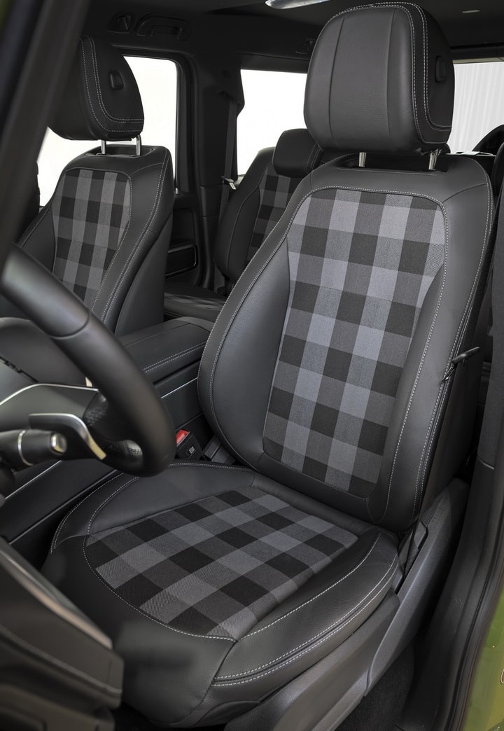В салоне Mercedes G-Class дорогая кожа Nappa сочетается с клетчатой тканью. Кроме того, на передней панели появились табличка с серийным номером модели и надпись Stronger than the 1980s. Комплектацию пополнили люк в крыше и мощная акустика Burmester 3D.